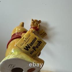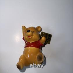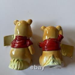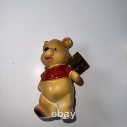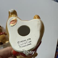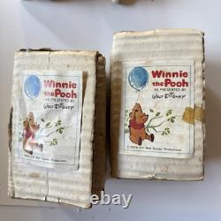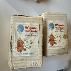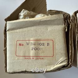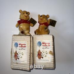 The standing figure is 5.5" and the seated one is 4.5". They're stamped on their bases with Enesco Japan 1964 and each has their original base sticker also. The glue that holds the color label on the boxes has lost its sticky and the labels are now loose but they could be glued back on easily. This is an immaculate sixty year old Winnie the Pooh Disney collectible.