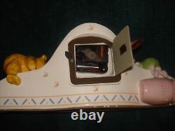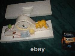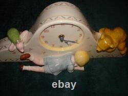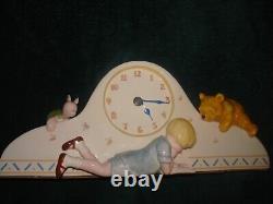This Charpente Winnie the Pooh Mantle clock is in pristine condition and was tested and works fine. The box is a little worn but it is the original box, and also comes with 6 new batteries. It is 13" long, 5 1/2" high, and 4 1/4 wide.