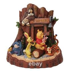 Tigger bounces nearby, Rabbit inspects the scene with care, Eeyore quietly lingers, and Owl watches wisely from above. Together, the gang gathers outside Pooh's tree, sharing a moment of friendship and warmth under the carved sign of Pooh's humble abode. This 7.48-inch stone resin figurine beautifully captures the charm of Winnie the Pooh and his friends. Designed by Jim Shore, it features intricate folk art-inspired details and subtle patterning that bring the scene to life. Perfect for fans of Pooh and collectors of timeless Disney moments, this delightful piece will make a heartwarming addition to your collection! About Disney Traditions by Jim Shore. Every Disney Traditions figurine is designed by renowned folk artist Jim Shore to capture a Disney character, movie or scene. Many are designed around a holiday, activity or just a good feeling. They are expertly sculpted with a subtle texture reminiscent of carved wood and then embellished with his famous folk art rosemaling and quilt patterns.Most figurines are made in quality stone resin and expertly hand-painted. See Item Specifics above for details.