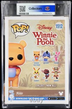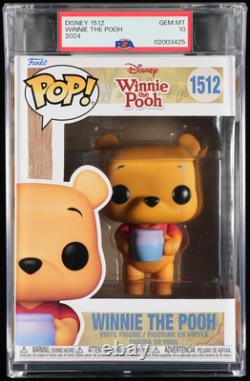 Ceci est une figurine Funko Pop! Vinyl de Winnie l'Ourson de la collection Disney, avec une note PSA 10 indiquant un état GEM MINT. Elle est certifiée par le Professional Sports Authenticator (PSA) et fait partie de la franchise Disney. La figurine représente le personnage de Winnie l'Ourson dans un thème de dessin animé, et elle est le numéro de modèle 1512 dans la collection Funko Pop!